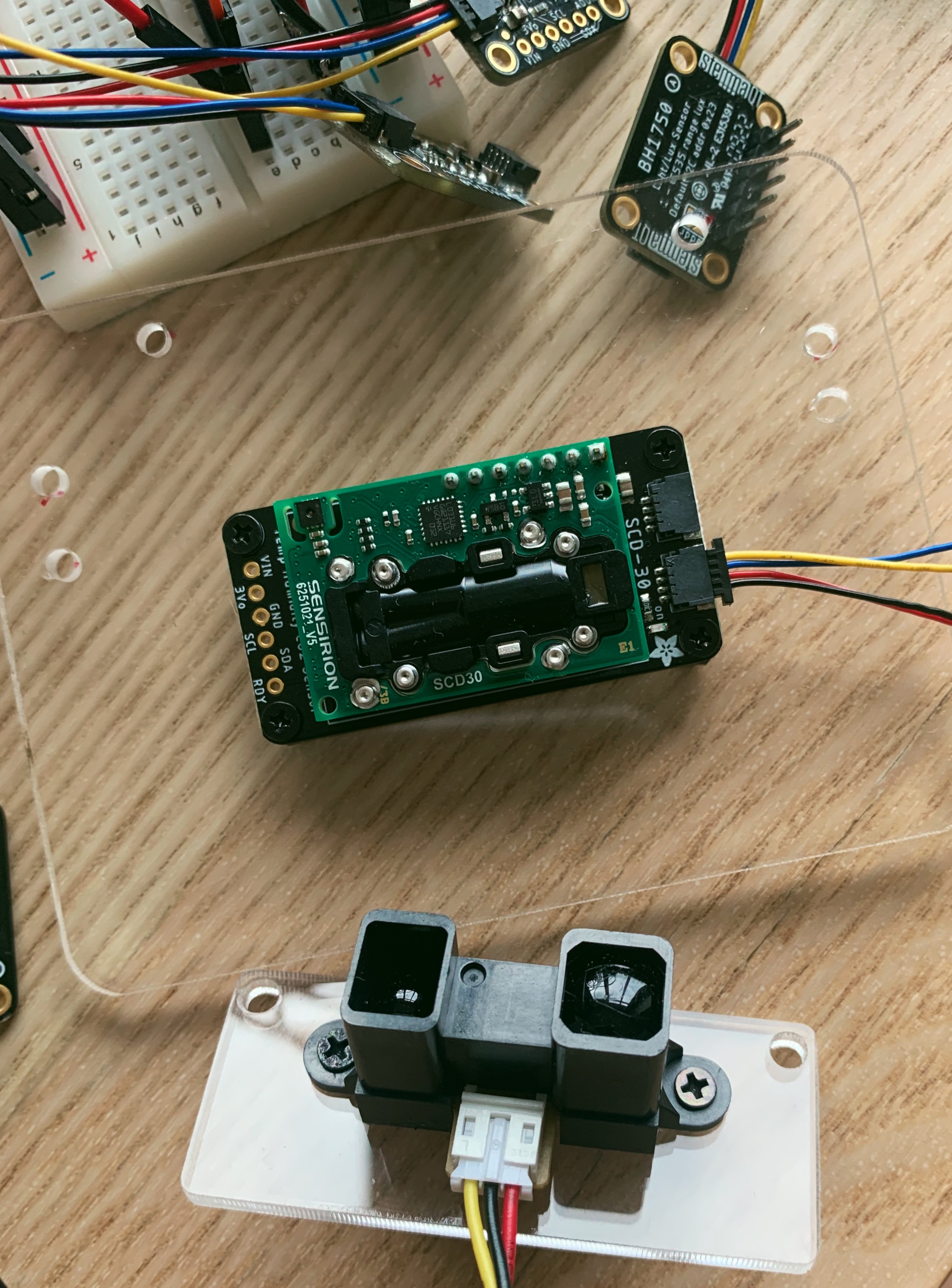 In this installation, I employed 24 light sensors with LEDs to sense algae’s movements, and a carbon dioxide sensor to measure the gallery’s CO2 level. All of these were run on a Raspberry Pi. The physical computing part has many challenges, as I assemble and solder components myself. I spent a lot of time debugging the programming and resolving compatibility issues between different parts, as some ports and interfaces on the Pi did not work together.